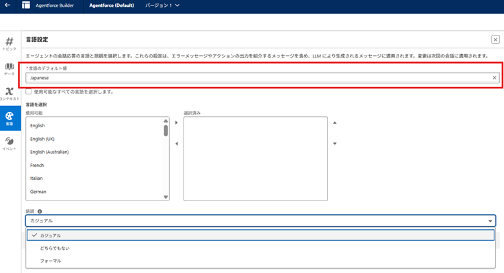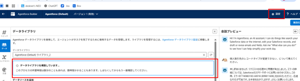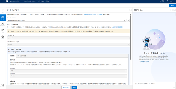 右側「データ」タブへいき、「Agentforce (Default) ライブラリ」を割り当て、保存します。