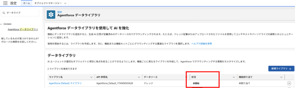 「Agentforce データライブラリ」が、状況=未開始であったことが原因でした。