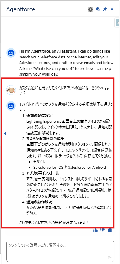 上記手順で、Agentforceを使うための事前設定が完了しました。
