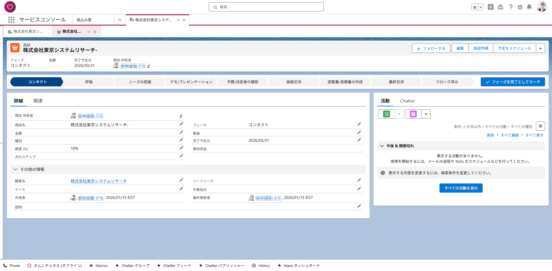 次のアクションを忘れないようToDoやリマインダーを設定したり、関係者への情報共有にChatter(チャター)を活用したりすることで、案件の進捗管理が効率化されます。