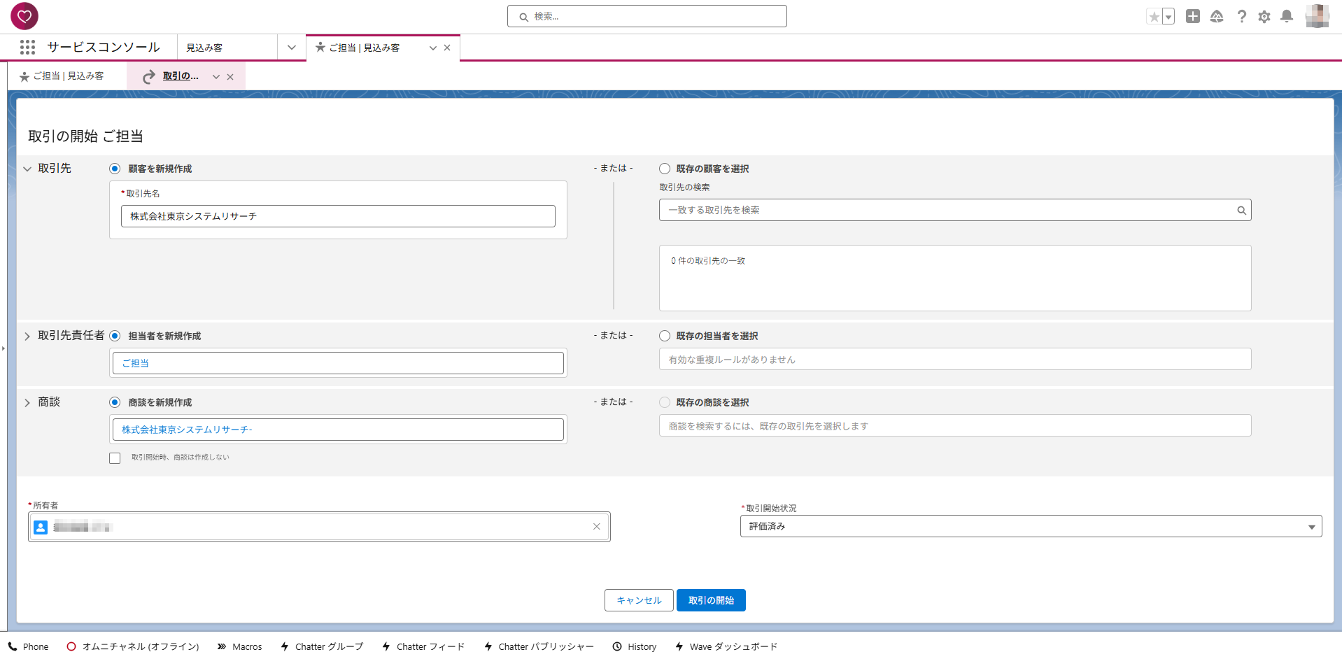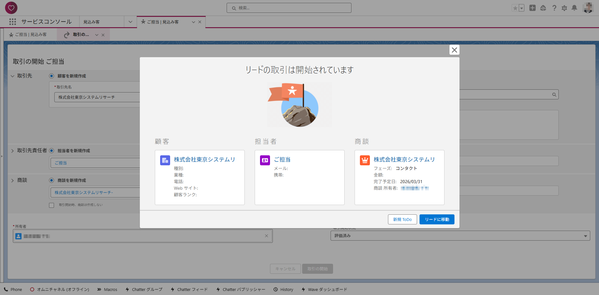 リードの詳細画面から「取引の開始」を選択すると、取引先・取引先責任者・商談の各オブジェクトに情報が引き継がれます。
