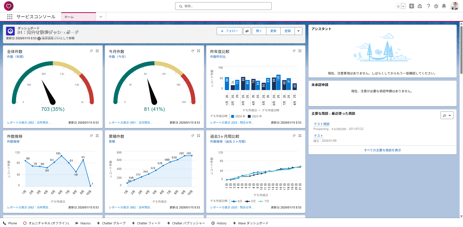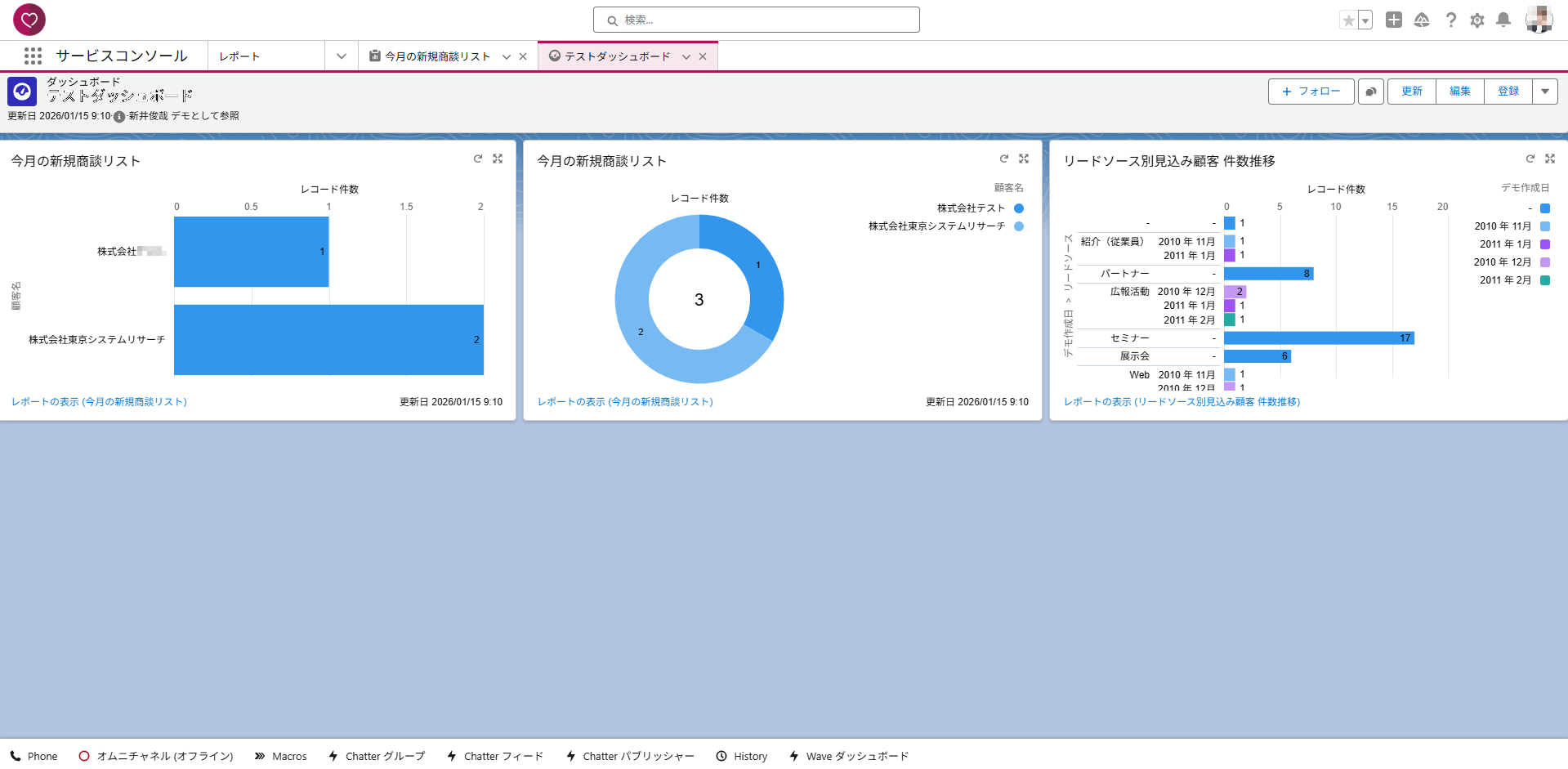 複数のレポートを組み合わせ、グラフや表形式で一つの画面にまとめたものが「ダッシュボード」です。