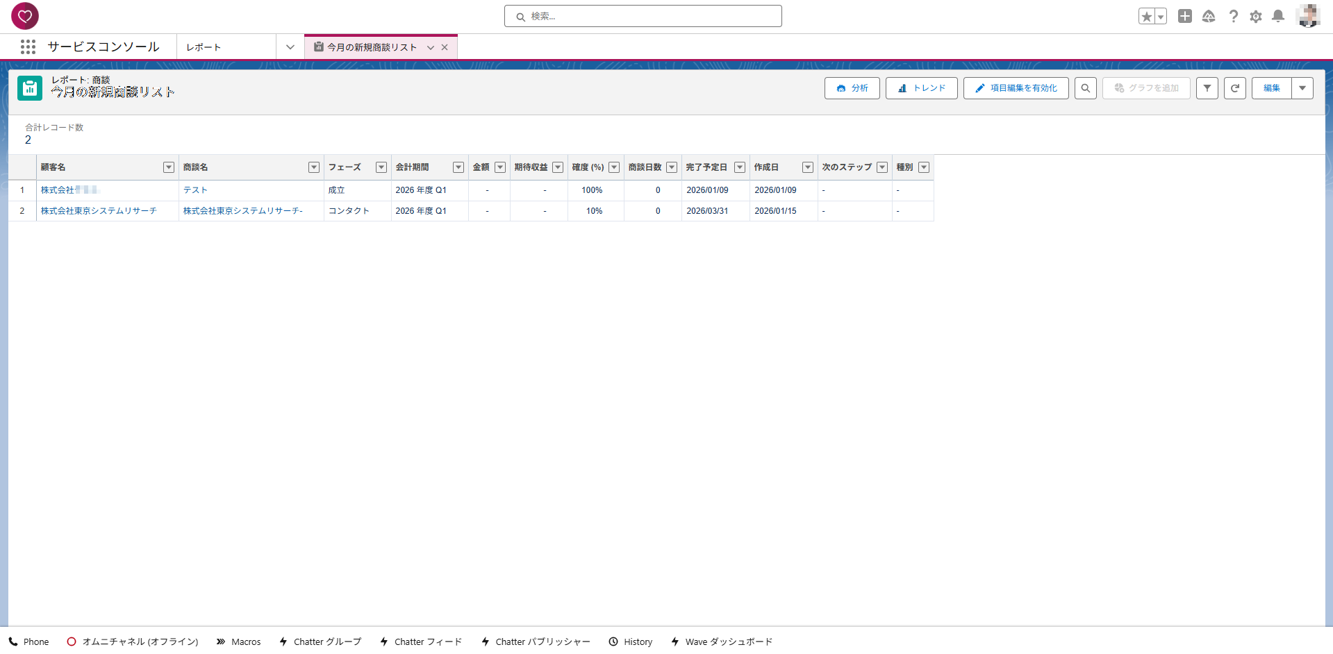商談レコードには、案件名、取引先、金額、受注確度、完了予定日、現在の進捗フェーズ(提案、見積もり、交渉など)といった情報が記録されます。